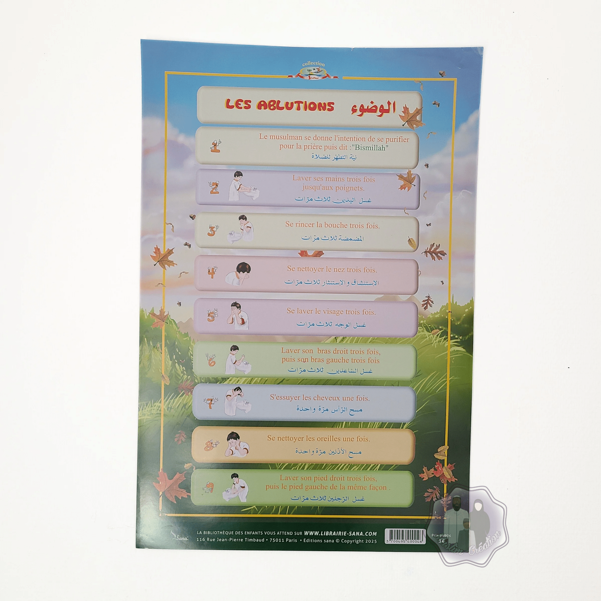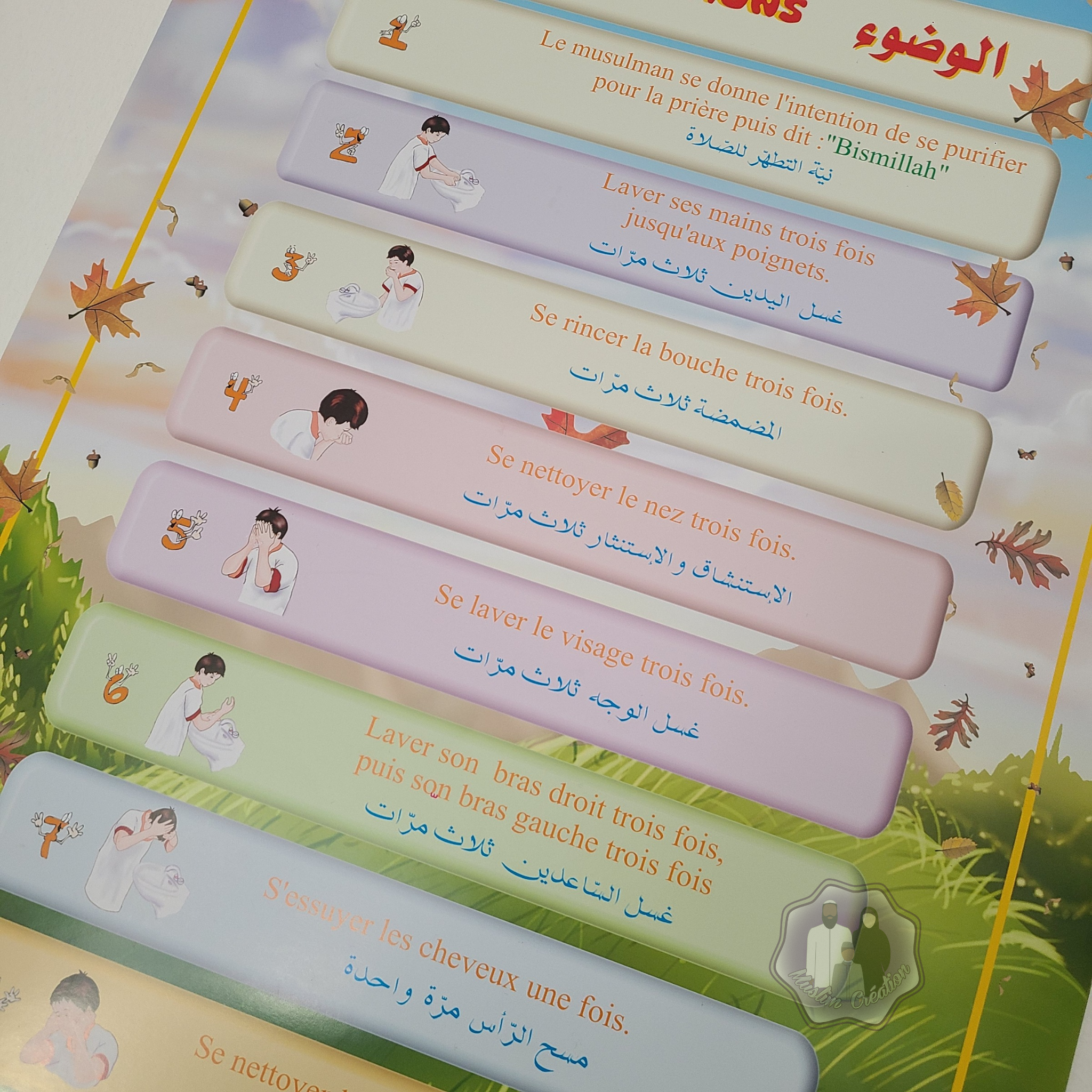 Poster L’ablution du petit musulman (40X60cm): Poster fabriqué spécialement pour les enfants afin de faciliter l’apprentissage de la purification de manière ludique et éducative. Grâce à celui-ci, ils apprendront comment se purifier pour accomplir par la suite la prière dès leur plus jeûne afin de pouvoir s’habituer jusqu’au jour où elle sera obligatoire pour eux.